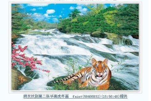 2、2007年11月15日晚九時許,網(wǎng)友"攀枝花xydz"在色影無忌華南虎臨時論壇里發(fā)帖稱:"老虎是假的。我今天仔細看我家的一副掛在墻上的老虎畫,除了耳朵不一樣,哪里都是一樣的,連老虎的紋路都是一樣的。但我不知道怎么傳圖,我已經(jīng)照下來了。"