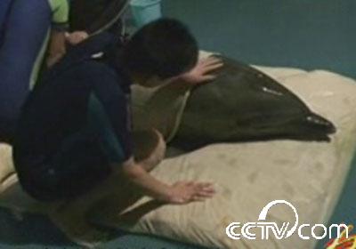 山東蓬萊海洋極地世界海豚館獸醫(yī)張建榮說,它游泳的姿勢發(fā)生了改變,仰泳 肚皮朝上,而且在池底吧,趴在池底不斷地摩肚子。