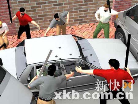 據(jù)自稱在遠處目擊了事發(fā)經(jīng)過的市民稱,當時前后兩車內(nèi)沖出6名蒙面男子,其中兩人手拿利斧、兩人手持砍刀、兩人拿著木棍。拿斧頭的兩男子對著豐田轎車的輪胎一陣亂劈,將輪胎砍破,拿木棍的男子則對著車窗玻璃猛擊,車窗玻璃被敲碎,另兩名男子拿著砍刀架在了車內(nèi)人員的脖子上。