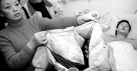 媽媽從床邊拿起一件乳白色羽絨衣,上面滿是腳印,已被撕扯得破爛不堪!爱敃r,我兒子就是穿著這件羽絨衣去采訪,事情發(fā)生后,三四個人沖上來搶攝像機,我兒子把攝像機藏在羽絨服里,那些人搶不到機器,對他拳打腳踢,他的背上全是腳!”話未說完,媽媽就泣不成聲了。爸爸憐愛地注視著兒子,默默無言……