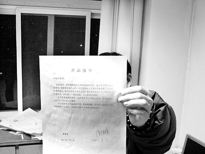 在左右權(quán)衡后,唐德連自知無法繼續(xù)勝任其工作,在2007年3月5日時,他以身體虛弱為由,向他的部門領(lǐng)導北石廠總工程師鄒連陽遞交了書面辭職報告。當天,北石廠廠長劉廣華把唐德連叫去談話,北石廠的意見是“不同意辭職”,但唐德連堅持以“身體支持不住”為由辭職。然后,唐德連將IBM電腦等公司物品交還,由職工單翠霞簽字確認,他隨即離開崗位。