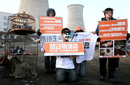 一名大學(xué)生穿著短袖,頭上戴著“貓咪”面具,身前放著一個(gè)“替動(dòng)物請(qǐng)命”的牌子跪在馬路上,一個(gè)女孩舉著印有“拒吃貓狗肉”的T恤衫跪在他旁邊。他們身后,幾名學(xué)生拿著“善待生命、刀下留情”的廣告牌陪同,學(xué)生們?cè)谏暮L(fēng)中“為動(dòng)物請(qǐng)命”,這是昨日發(fā)生在鴿子市場(chǎng)的一幕。他們希望用這種方式感染那些虐殺動(dòng)物的商販,讓商販們放下“屠刀”、珍愛(ài)生命。