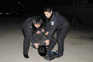 1月10日23時(shí)許,佳榮里派出所民警正在劉家房子前大街巡邏,突然聽到有人大喊捉賊,巡邏民警立即驅(qū)車前往事發(fā)地,見一名年輕男子發(fā)了瘋一樣向一條胡同內(nèi)拼命逃竄。民警立即用無線電臺(tái)呼叫正在附近巡邏的村治保會(huì)人員,前后夾擊,將這名男子堵在胡同內(nèi)并將他擒獲。隨后趕到的群眾張先生講,當(dāng)晚11點(diǎn)半左右,他剛?cè)胨,就聽到大院?nèi)咕咚一聲響,他立即開門,發(fā)現(xiàn)一名陌生男子正在撬鄰居的房門,他大喊一聲:“有賊!”男子見狀,翻過墻頭就跑,張先生在后面緊追,后這名男子被巡邏民警和村治保會(huì)人員當(dāng)場抓獲。