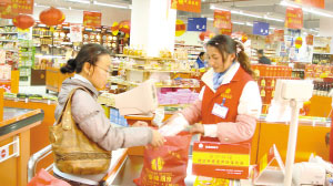 農(nóng)貿(mào)市場上小商販用編織袋給消費(fèi)者裝東西