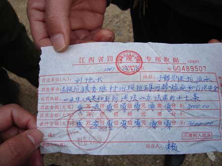 劉地長(zhǎng)告訴記者,去年,于都縣水務(wù)局第一次來(lái)查采砂點(diǎn)時(shí)沒有罰款。去年12月18日,水務(wù)局開了一張3000元的罰單,說是采砂點(diǎn)阻礙河勢(shì)穩(wěn)定和堤壩安全。