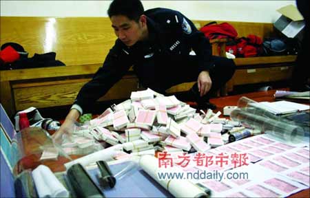 隨后,偵查員將小轎車車主吳某押至其租住的浪尾村出租屋。民警沖進(jìn)房間,將正在房間內(nèi)整理假票的吳某妻子抓獲,當(dāng)場繳獲成品假火車票3張和半成品假火車票3萬張,以及制造假火車票的專業(yè)印刷排版工具一批。偵查員在抓獲主要犯罪嫌疑人的同時,另一路專案組偵查員也同時直撲藥店,一舉將正在該藥店進(jìn)行假票銷售交易的嫌疑人尹某和廖某當(dāng)場抓獲,在該藥店火車票代售點(diǎn),警方搜出了大量用于訂票所用的單據(jù)和憑證。