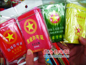 24日下午,記者在黃埔軍校舊址紀(jì)念館大聯(lián)盟商店的一攤紀(jì)念品中,赫然發(fā)現(xiàn)一只紅彤彤的“泡妞許可證”,拿起來方知是只鐵皮煙盒。除此之外,還有以國徽為背景的“中華人民共和國超級帥哥證明”、“泡哥許可證”、“靚女證書”、“土匪資格證”、“流氓合格證”、“光棍證”、“傻B證”等五花八門的煙盒。