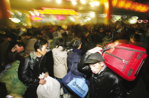 昨晚9時(shí)許,西站北廣場(chǎng)各進(jìn)站口的旅客排起數(shù)條長(zhǎng)龍,站內(nèi)顯示屏顯示:值春運(yùn)客流高峰,進(jìn)出站臺(tái)旅客猛增,即日起停售站臺(tái)票,所有進(jìn)站旅客憑當(dāng)日車票于開車前4小時(shí)內(nèi)進(jìn)站候車。站內(nèi)廣播多次播放通知,為保證旅客安全,站內(nèi)地下二層開通臨時(shí)候車區(qū)。