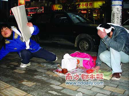 記者趕到時(shí),只見一男一女跪在地上,他們頭上系著白布,旁邊點(diǎn)著蠟燭,放著骨灰盒,燒著紙錢。圍觀的市民被這一場景感動(dòng),紛紛慷慨解囊。記者詢問時(shí),女子一直支支吾吾并抽泣。記者拍照時(shí),女子用石塊砸向記者。男子對(duì)記者說:“這本來就是騙錢!” (記者 馬小六)