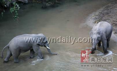 26日下午3點(diǎn)09分,29頭野象在野象谷景區(qū)樹(shù)上旅館下方的河谷中玩耍正酣,突然,游客中發(fā)出一陣哄笑。一頭長(zhǎng)著一對(duì)長(zhǎng)長(zhǎng)象牙,雙眼眶旁各出現(xiàn)一條濃墨狀、如同粗眉一般線條的大公象在召喚旁邊的一頭母象。母象與公象相互叫喚呼應(yīng)著。最終趟過(guò)河水來(lái)到公象身邊的沙灘上,開(kāi)始伸出鼻子與公象首尾相接,并各自用鼻子嗅著對(duì)方的下腹部轉(zhuǎn)了幾圈。