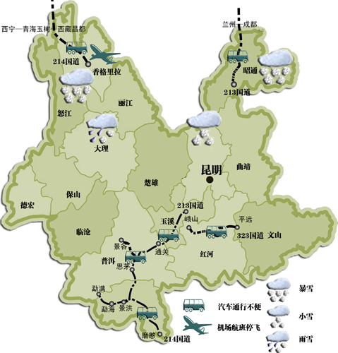 昨天下午6點,云南省氣象臺發(fā)出了大雪結冰預警,預計從30日晚上8點至31日上午8點,由于冷空氣向南擴散,滇西北地區(qū)仍有中到大雪,局部地區(qū)暴雪;滇中以東地區(qū)有小雪和冰凍天氣。據(jù)氣象臺觀測到的數(shù)據(jù)顯示:昨天上午開始,停留在昭通和迪慶的冷空氣突然向南移動,天氣剛剛有所好轉(zhuǎn)的昭通又開始飄雪,曲靖的宣威、沾益、會澤一帶氣溫急劇降低10度左右,昨天下午氣溫降到零下3度,今天部分地區(qū)可能出現(xiàn)短時雨雪;滇西北的迪慶香格里拉昨天依舊大雪紛飛,這一區(qū)域的冷空氣也開始向大理、麗江蔓延,昨天,大理的洱源縣也下起了雨雪。