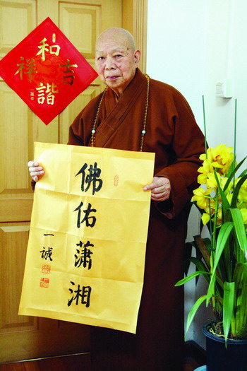 坐在北京廣濟寺中國佛教協(xié)會辦公室里,全國政協(xié)常委、中國佛教協(xié)會會長一誠大和尚不禁面露愁云,為家鄉(xiāng)湖南遭遇雪災而擔憂著。80高壽的一誠大和尚用稍微有點顫抖的手提起了筆,飽含深情地寫下了“佛佑瀟湘”四個大字,“祈愿家鄉(xiāng)湖南能永離災難,人們幸福安康”。為此他還準備為家鄉(xiāng)捐出5萬元。