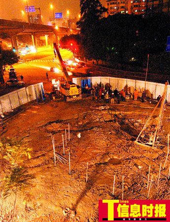 附近工人告訴記者,事故發(fā)生在下午6時(shí)左右,之前已經(jīng)灌漿填補(bǔ)的位置突然再次下陷,深度約30厘米,而且中間位置還出現(xiàn)手掌寬的一道裂紋,好在當(dāng)時(shí)工地內(nèi)并沒(méi)有出現(xiàn)意外,施工部門(mén)立即著手搶險(xiǎn)施工。