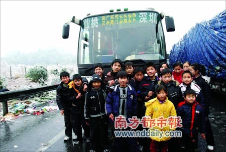 “記者同志,救救我們吧,我車(chē)上有20多個(gè)小孩!”昨日上午10時(shí)30分左右,南方都市報(bào)記者姜鏘和徐文閣正在京珠高速公路受災(zāi)最為嚴(yán)重的廣東省韶關(guān)市坪石入口附近采訪,一位穿著綠色軍大衣面容憔悴的司機(jī),攔下了記者的采訪車(chē)。