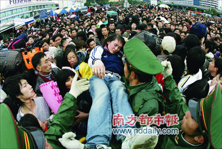 廣州火車站廣場(chǎng),一位暈倒的旅客被接力式從等待進(jìn)站的人群中送出,武警隨后將她抬至正對(duì)著火車站進(jìn)站大廳的臨時(shí)醫(yī)療中心。張駿攝