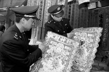 執(zhí)法人員立即讓該店停止銷(xiāo)售行為,質(zhì)問(wèn)其是否知道把人民幣圖樣印在年畫(huà)上是違法行為時(shí),店家連說(shuō)不知道,說(shuō)年畫(huà)上印上人民幣就圖個(gè)吉利。在隨后的檢查中,執(zhí)法人員發(fā)現(xiàn)許多年畫(huà)上都印有人民幣圖樣,而店家卻無(wú)一知曉這是違法行為。“我們只是覺(jué)得吸引客人,大家都圖個(gè)財(cái)源滾滾,真不知道這是違法的。”一家年畫(huà)店的張姓老板說(shuō)。