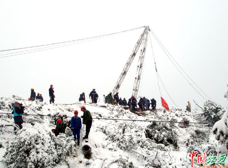 隨著災(zāi)情的進一步加劇,萍鄉(xiāng)市人民政府在當日下午18時隨即啟動了大面積停電事故應(yīng)急預(yù)案Ⅰ級響應(yīng),市委書記謝亦森、市長曾慶紅等市領(lǐng)導(dǎo)先后來到萍鄉(xiāng)供電公司,了解指導(dǎo)電網(wǎng)抗冰搶險與電力供應(yīng)保障工作。供電部門也加緊了對受損電網(wǎng)的搶修。萍鄉(xiāng)巨大的災(zāi)情引起了省電力公司的高度重視。1月25日,省電力公司總工程師譚永香親臨萍鄉(xiāng),深入蓮花縣現(xiàn)場視察災(zāi)情,指導(dǎo)萍鄉(xiāng)供電公司做好抗冰搶險保供電工作;1月30日,省電力公司黨組書記、總經(jīng)理毛日峰又委派了省電力公司副總經(jīng)理肖黎春火速趕往萍鄉(xiāng),坐鎮(zhèn)指揮和督導(dǎo);在1月24日調(diào)集了省水電工程局和武警水電總隊共180余名增援隊伍后,1月30日,省電力公司又調(diào)集贛州供電公司近30名精兵強將強力增援萍鄉(xiāng)。至此,加上萍鄉(xiāng)供電公司和贛萍公司的搶修人員,一共有近3000名電力員工投入到萍鄉(xiāng)電網(wǎng)抗冰保供電中。