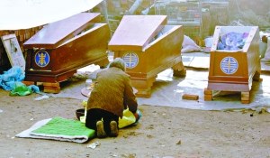 昨日,唐縣倒馬關(guān)鄉(xiāng)夾子村柴振國(guó)家中,白色塑料布將前后院罩住,院內(nèi)搭起了簡(jiǎn)易的靈棚。7口大棺材和2口小棺材擺在門前,9具尸體停放在前后院,陣陣哀哭聲從靈棚中傳出。