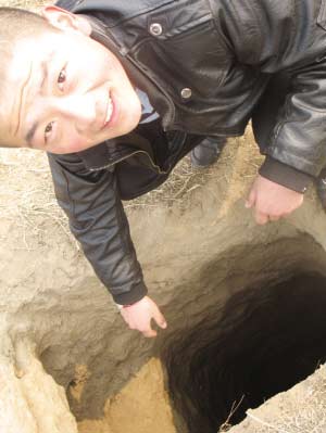“不知誰在村西山頭上挖了兩個(gè)深洞,很奇怪!弊蛱焐衔,記者接到村民提供的報(bào)料后立即趕到現(xiàn)場(chǎng)采訪。在村民的指引下,記者看到在兩座長(zhǎng)滿雜草的古墓土堆上被人挖出兩個(gè)深約5米、直徑在1米左右的洞。村民告訴記者,前幾天,有人發(fā)現(xiàn)一到深夜,就有幾個(gè)人影在這里挖什么東西,村民們也沒有在意,可是昨天早上,有村民上山時(shí)突然發(fā)現(xiàn)了這兩個(gè)很奇怪的洞,一名膽大的村民還系著繩子下去看,洞口雖然剛好容一個(gè)人下去,但洞里面卻有很大空間。