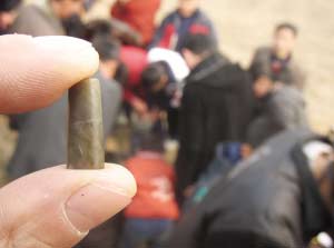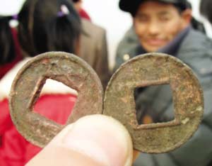 昨天上午,許多住在西石橋村周圍的村民聽說此事后,紛紛趕來尋寶。記者在現(xiàn)場(chǎng)看到,幾十名當(dāng)?shù)卮迕衲弥ぞ咴谕炼牙飦y挖,還有的村民將剛剛挖出來的古錢幣拿給記者看。一名姓王的大爺拿著幾枚挖出來的錢幣告訴記者,過去在這座古墓周圍,曾出現(xiàn)過許多這樣的古錢幣,聽老一輩講,很久以前這里就是一片墳地,盡管也有村民種地時(shí)經(jīng)常發(fā)現(xiàn)古錢幣,但從來沒有人敢到這里亂挖的。記者現(xiàn)場(chǎng)看到,聞?dòng)嵹s來挖寶的村民越來越多,一上午先后有上百人光顧。村民挖出的這些古錢幣上有不規(guī)則的花紋。