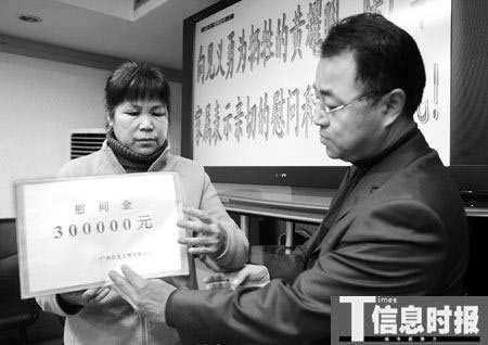 去年10月起,廣州市見義勇為基金會將見義勇為犧牲和傷殘者的獎勵慰問金額大幅提高。調(diào)整涉及的獎勵慰問金金額涉及七個檔次,全部都有五成以上的提幅,其中“加碼”幅度最大的是對見義勇為犧牲者的獎勵金,將最高獎勵金額從原來的5萬元提高至30萬元。昨日,最高獎勵30萬元首次各頒發(fā)給兩名犧牲者,由于現(xiàn)金發(fā)放不便,基金會特別將獎勵金慰問金存入存折內(nèi)。這筆錢,將給見義勇為英雄家中需要贍養(yǎng)的老人和需要撫養(yǎng)的未成年子女更多的保障。