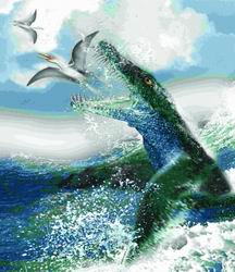 科學(xué)家稱,上龍?zhí)幱谫_紀(jì)時(shí)期海洋食肉動物頂層,主要以魚龍為食,也大量捕食烏賊、魚類和其他水生食肉動物。