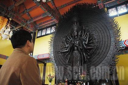龍泉石經寺內雕成的東南亞最大烏木千手觀音,所用烏木據測已有7000年歷史。昨(11)日,這尊千手觀音首次亮相,展露祥容。本月22日,石經寺將舉行盛大開光儀式,(四川)省內外高僧大德云集,并進行學術研討,烏木千手觀音將正式向游人開放。