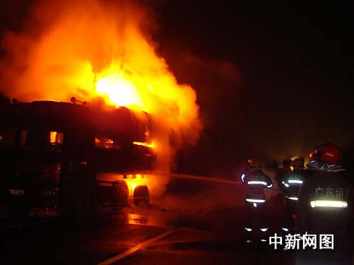 當晚10點35分許,乳源消防中隊接到報警后,立即兩臺水罐消防車和13名消防官兵,與交警、路政等部門先后火速趕到現(xiàn)場進行滅火。