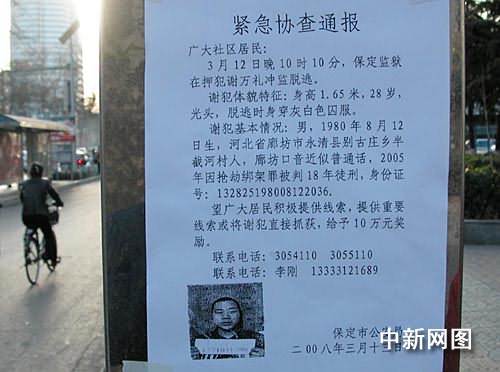 據悉,事件發(fā)生后,保定監(jiān)獄及當?shù)毓、武警等部門出動大批警力在周邊各個主要路口設卡布控,同時在市區(qū)街道、小區(qū)醒目位置張貼通告,全力通緝追捕越獄逃犯。(完)