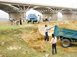 下午3時左右,兩輛微型卡車就在大橋南岸的橋墩旁進(jìn)行挖砂,不到二十分鐘就裝了滿滿兩車開走了。據(jù)悉,今年以來河砂價格飛漲,“出廠價”從原來的每立方米十幾元漲到了現(xiàn)在的68元,只要挖一拖拉機(jī)的砂就能賺兩三百元。