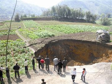 2008年3月25日凌晨,宜賓江安縣紅橋鎮(zhèn)五閣村發(fā)生了局部地面塌陷,形成大小不等的3個巨型“天坑”,呈直線展開,長約400米。塌陷嚴(yán)重威脅到附近的11家住戶57人。險情發(fā)生后,江安縣委、縣政府及當(dāng)?shù)丶t橋鎮(zhèn)政府立即緊急疏散塌陷影響區(qū)域內(nèi)的居民,并對“天坑”實(shí)施24小時的臨時警戒,防止意外事故發(fā)生。截至昨日,國土資源部門的地質(zhì)專家現(xiàn)場查勘得出的初步結(jié)論是:該地面塌陷是因?yàn)榈叵氯芏匆l(fā)的小型巖溶塌陷,是自然形成的地質(zhì)災(zāi)害;進(jìn)一步的結(jié)論及處置措施待觀察3—5天后再定。
