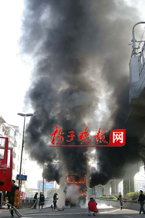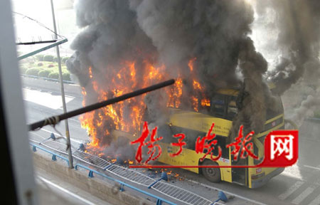 昨天上午7時55分,一輛雙層100路公交車在南京市雨花西路高架橋沿線尾部發(fā)生自燃,濃煙升騰數(shù)十米。時值上班高峰,公交車內有乘客60多位。一騎車上班的市民發(fā)現(xiàn)火情后,奮追100多米,向駕駛員通報火情,隨即司機停車并及時疏導乘客,后因火勢太大,公交車瞬間成了“火”車,還危及地鐵中華門站10多米高正在運行的地鐵線。隨即,消防官兵趕到現(xiàn)場,撲救大火。整個過程中,沒有乘客受傷。但是大火將公交車燒成了一個空殼,烤化了附近的店家門面招牌,熏黑了地鐵柵欄,道路旁的植物也被烤死。