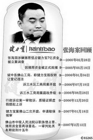 去年2月12日,佛山中院對前健力寶總裁張海職務(wù)侵占、挪用資金一案作出一審判決。該院認(rèn)為,張海利用職務(wù)之便,侵占健力寶集團(tuán)資金人民幣12074.824208萬元;挪用健力寶集團(tuán)資金人民幣8644.678685萬元,據(jù)此判處張海有期徒刑十五年。判決后,張海馬上表示不服上訴。事隔一年零兩個(gè)月,該案的二審將在今天正式開庭。出于安全等原因,省高院借用了佛山中院的法庭審理案件。