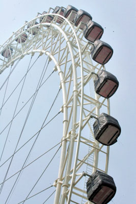 施工人員告訴記者,奧運會開幕之前,“天津之眼”不僅將揭開這層黑“蓋頭”,還將真正地轉動起來。屆時,游客乘坐摩天輪最高可到達120米左右的高空,相當于35層樓的高度,能飽覽方圓40公里以內的景致。“天津之眼”也將超過英國泰晤士河畔號稱“世界最大”的“倫敦之眼”,躍居世界第一位。(記者 段毅剛 攝)