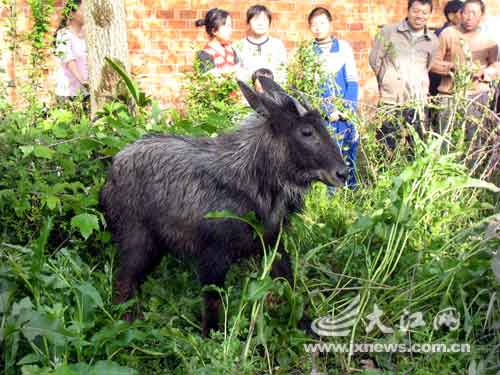 無獨有偶,昨日下午3時,距都昌縣中館鎮(zhèn)幾公里的鄱陽縣銀寶湖鄉(xiāng)銀寶村農(nóng)民馮奇,在自家門前的菜園內(nèi)發(fā)現(xiàn)一只“野山羊”在偷吃菜葉。只見這家伙身高1.2米左右,體重約100公斤?吹接腥藝^,“野山羊”飛快逃竄,村民們四處堵截,3個小時后才將它在一條胡同內(nèi)制服。鄱陽縣林業(yè)局的野保專家趕到現(xiàn)場告訴村民,這只“四不像”學(xué)名叫蘇門羚。