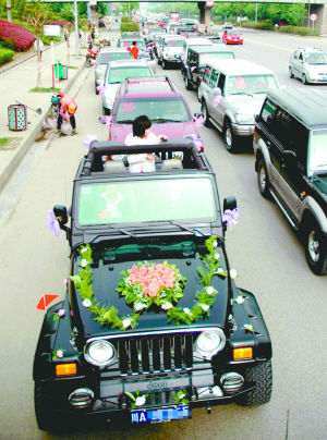 三菱帕杰羅、陸地巡洋艦、大切諾基、豐田普拉多、本田CRV、牧馬人……昨日上午,52輛各種品牌的越野車,組建成綿延1公里長的婚車隊伍,從西門穿城到東門迎娶美麗的新娘子,又浩浩蕩蕩地朝東湖公園婚禮現(xiàn)場進(jìn)發(fā),好不拉風(fēng)!新娘子說:“戀愛8年啦,就想要這么一場轟轟烈烈的婚禮!”