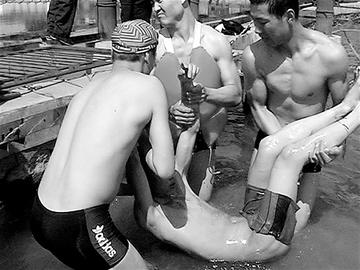 此時,一個穿著泳褲的30歲左右的男子扒開人群,跳進冰冷的湖水中,同消防官兵一起搜尋溺水者!澳莻小伙聽說消防官兵在救人,趕緊跑到附近游泳館買的泳褲!蹦繐粽邊卿h告訴記者。