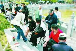 近日,隨著節(jié)假日游客的增多,(北京)后海荷花市場旁悄然興起的街頭按摩行業(yè)越發(fā)紅火,這些“按摩師”把目標投向了來后海觀光的游客們,一些因長時間步行而勞累的游客對此也顯得頗有興趣。 (李剛攝)