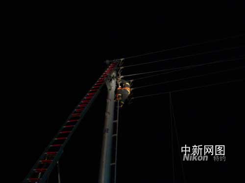 消防隊員到達現(xiàn)場后才發(fā)現(xiàn)是一名小偷因偷高壓線,被困在電線架上,人已經(jīng)沒有生命跡象。公安行偵大隊、派出所、電力先到場后都無能為力,需要消防救援。消防指揮員通過觀察現(xiàn)場和詢問電力部門技術(shù)后,馬上出了一套方案用15米金屬拉梯救人,拉梯馬上起架,同時用搶險救援車照明,但由于地面有落差,拉梯不好起架,第一套方案結(jié)束。這時電力部門在旁邊建議,可以用高壓電線桿的攀手到達目的地救人,但電力部門人員又沒有能力上去。消防接受任務(wù)后,馬上決定派出兩名優(yōu)秀的消防隊員上去營救。但由于距離比較高,又擔(dān)心高壓電,指揮員決定親自上去營救。