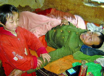 小秋偉的父親馬懷福癱瘓?jiān)诖玻稍诳拷皯舻囊粡埓采,臉龐黃瘦,雙手瘦得只剩下一層老皮,身上蓋的棉被有四五處露著棉絮。