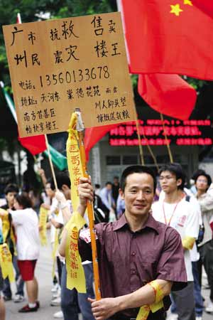 昨日,有一個(gè)人,隨著號(hào)召募捐行動(dòng)的志愿者隊(duì)伍,從正佳廣場(chǎng)西北門(mén)的活動(dòng)現(xiàn)場(chǎng)一直跟到另一主會(huì)場(chǎng)僑鑫教育大院。他始終默默站著,沒(méi)和任何人說(shuō)話;而他手上,則舉著一塊自己制作的簡(jiǎn)陋牌子,上面寫(xiě)著“廣州市民抗震救災(zāi)售賣(mài)樓王”,引來(lái)好多路人觀望。