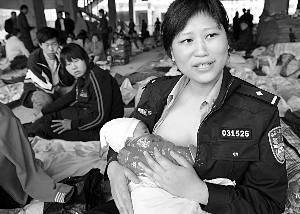 14日,蔣小娟來到災民帳篷區(qū),看到四名嬰兒只能吃一些水和稀飯,一名嬰兒的母親還在醫(yī)院搶救。“他們三天沒有吃奶了!笔Y小娟撩起衣衫露出乳房,輕輕地將乳頭塞進嬰兒的嘴里。