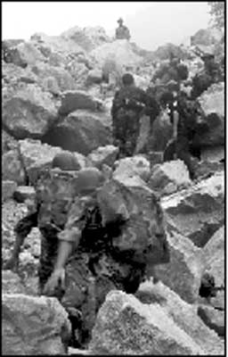 在小分隊(duì)爬行上方20米處,鋼盔大的石頭沖著小分隊(duì)隊(duì)員砸下來。