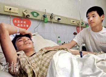 不過,醫(yī)院工作人員表示,廖波的傷口有感染征狀,可能需要再動手術(shù),他也經(jīng)常做噩夢而驚醒,一次次回到地震當天的情景,想起遇難的同學(xué)就會流淚。見此情況,李陽想多陪廖波幾天,在醫(yī)院亦有北川中學(xué)的老師,答應(yīng)照顧李陽的衣食住行,并會在他復(fù)課前帶他返校。