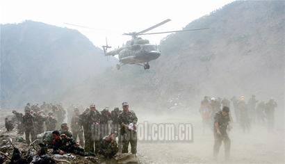 昨日上午9時(shí),記者登上運(yùn)送搶險(xiǎn)物資的直升機(jī),飛機(jī)穿過北川縣城南端的險(xiǎn)要溝壑后,緩緩飛入四處塌方、滑坡的唐家山山谷。透過飛機(jī)的舷窗,遠(yuǎn)遠(yuǎn)地可以看見前下方狹長河堤上有一個(gè)巨型堤壩,堤壩上面的凸出部位依稀可見隨風(fēng)飄揚(yáng)的紅旗!斑@是搶險(xiǎn)部隊(duì)插的,你看上面都有他們的部隊(duì)名稱呢!彪S機(jī)護(hù)送物資的戰(zhàn)士解釋說。