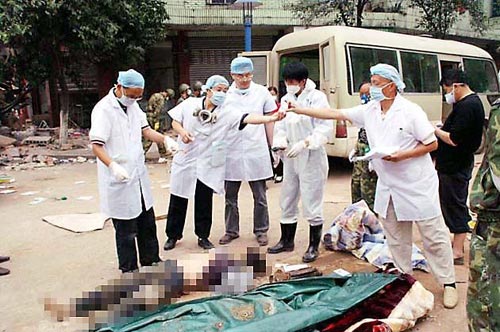 解放軍戰(zhàn)士不懈地挖掘,用雙手搬開大大小小的磚頭和石塊似的水泥碎塊,兩臺大型機械不停地工作,不時有遇難者尸體從廢墟中被發(fā)現(xiàn)。戰(zhàn)士們把這些尸體抬到路邊,有人專門噴灑消毒粉劑,然后我們便為死者清洗面部,以便家屬辨認(rèn),視聽技術(shù)人員拍照。無家屬辨認(rèn)的尸體,我們就從尸體肋部取下一塊軟骨放進(jìn)預(yù)先備好的固定液瓶里編號保存。挖出的尸體大多數(shù)都已變形,有的肢體殘缺,腐爛嚴(yán)重,操作者不得不戴上防毒口罩。