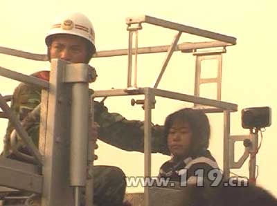 女子距離地面近30米,指揮員命令用云梯車將特教老師送到高壓電塔附近的一個二層樓樓頂,近距離與女子溝通,可就在云梯車剛剛啟動的時(shí)候女子又扔下一張紙條,“你們的車如果再靠近我就跳下去”,云梯車只好原地待命。