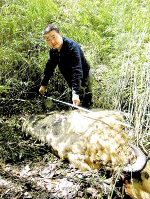 唐家河國家級自然保護區(qū)管理處副處長鮮方海拿出一疊照片說:“僅僅在交通恢復的林區(qū)邊緣地帶,就發(fā)現了國家一級保護動物牛羚死亡了兩頭,都是滑坡被砸死的!庇捎诨聡乐,目前無法進入山林的腹心地帶,他們僅在林區(qū)邊沿地帶搜索動物的行蹤,就發(fā)現了牛羚、金雕、野山羊等至少15具動物的尸體,其中大部分是國家保護類動物。