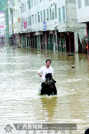 連日強降雨,凌云縣邏樓鎮(zhèn)已變成一片澤國。圖為鎮(zhèn)上一名居民騎馬出行。