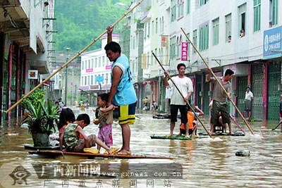 內(nèi)澇淹城鎮(zhèn),居民進出很不方便。凌云縣有關(guān)部門調(diào)派了卡車和沖鋒舟,供沿線居民進出。記者看到,許多進城鎮(zhèn)小車被擋在外面,兩輛卡車由于涉水能力強,負責(zé)運送過往的村民和物資。有的市民自制竹伐或涉水工具,渡“河”出行,有的居民還牽出馬來,騎馬過“河”。